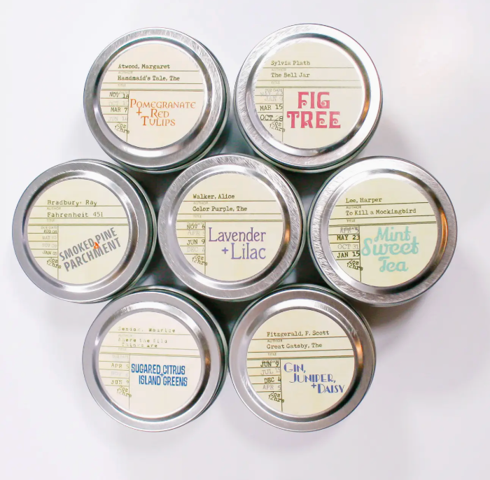 These travel-sized candles are smaller versions of all the scents from our Banned Books Collection and Candle Library lines. • a cost-efficient way to sample several options • great way to introduce customers to new scents • make great giftables / stocking stuffers  • nice addition to gift baskets, sub boxes, etc • fun cash register add on minimum of 6 tins *we will attempt our best to honor requests for specific scents, otherwise a seasonally appropriate selection will be curated for you. We are happy to work with subboxes or any other occasion where you would need several of one specific (or even custom!) scent/book! Just reach out! 2oz | 10-12 burn hours each 1.5″ height 2″ diameter book candle / bookish candle / bookstore gift / bookshop sidelines / subscription box items / sub box