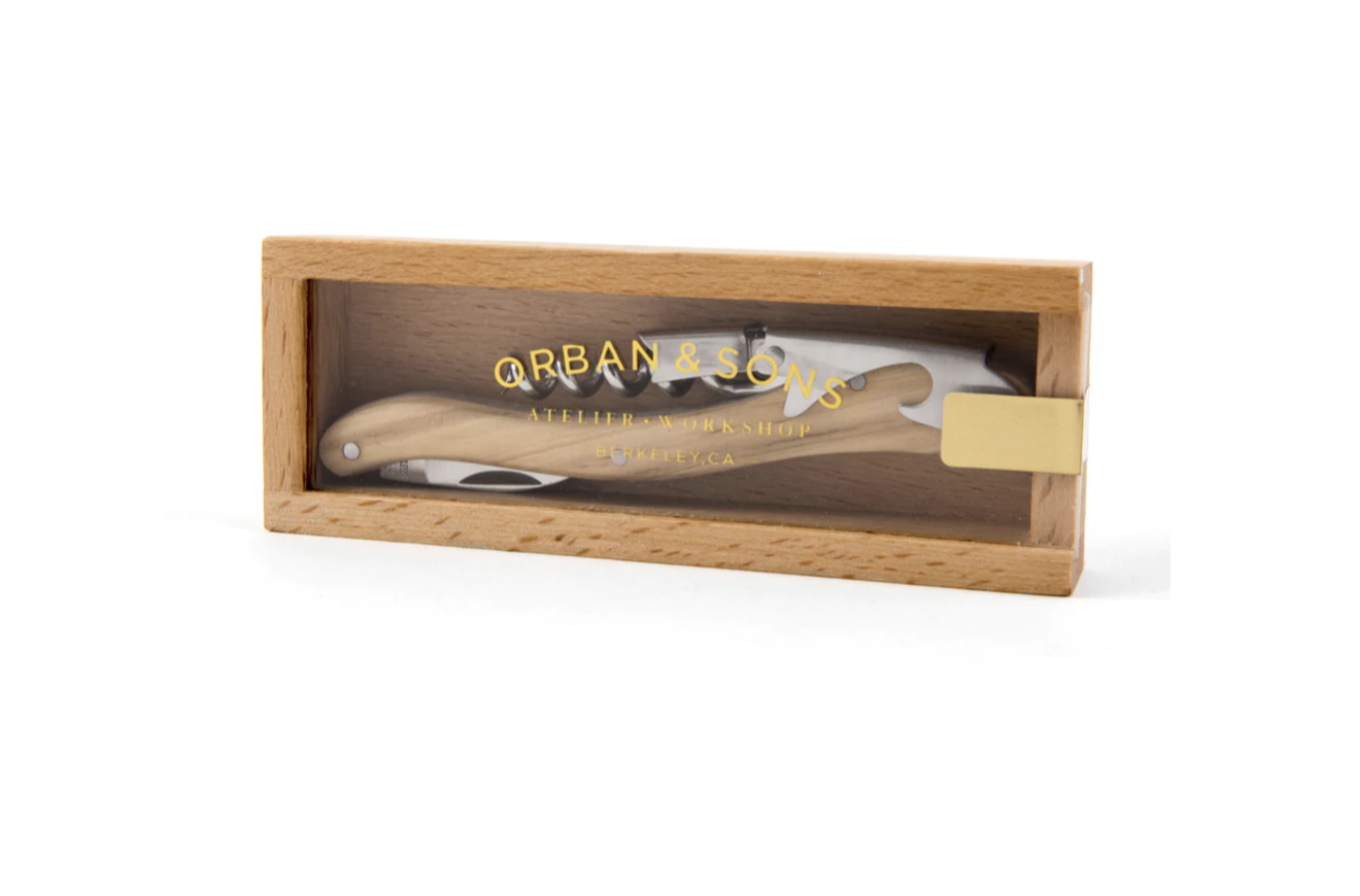Double hinged corkscrew with olivewood handle. Comes in wooden box with sliding acrylic lid.