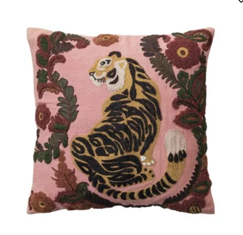 This pillow, adorned with an embroidered tiger and a flourish of flowers, brings a world of color and design to the home. The multi-hued embroidery pops against the pillow's fabric, offering a bold statement piece that complements global, boho, and transitional styles. It measures 20.0 inches in length and 20.0 inches in width, making it a substantial addition to any room. The blend of cotton and polyester materials ensures both comfort and durability, while the generous dimensions make it a versatile and inviting accessory for any seating area or bedroom.