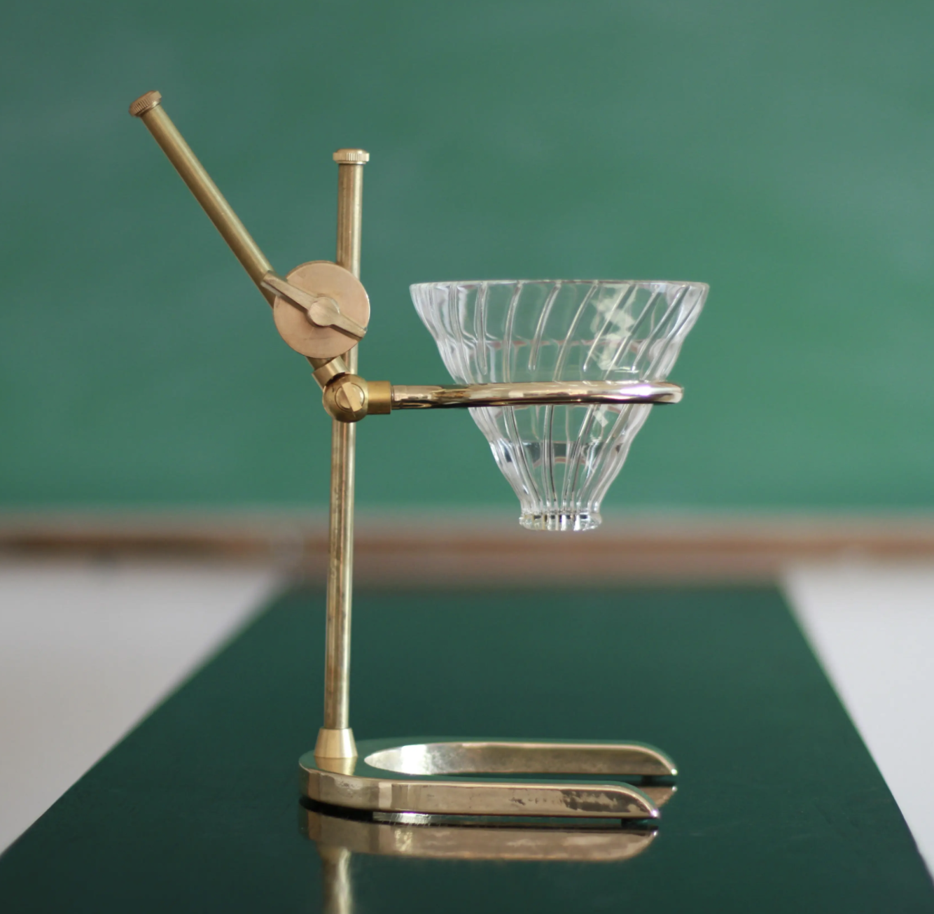 Crafted from brass in a Victorian style, The Professor utilizes the Hario V60 glass pour over (included) resting on the ring to adjust to the height of your mug or decanter. The ring adjusts using the brass arm and rod to the height you need. The base is made of beautiful American Walnut finished with simple food safe coating.