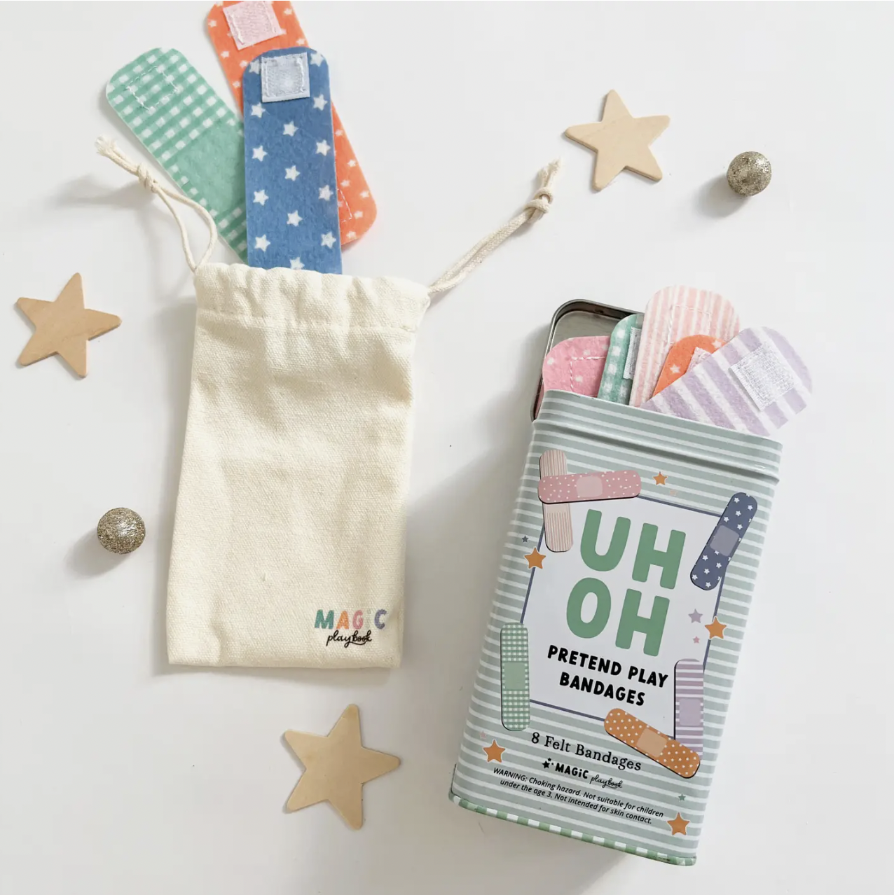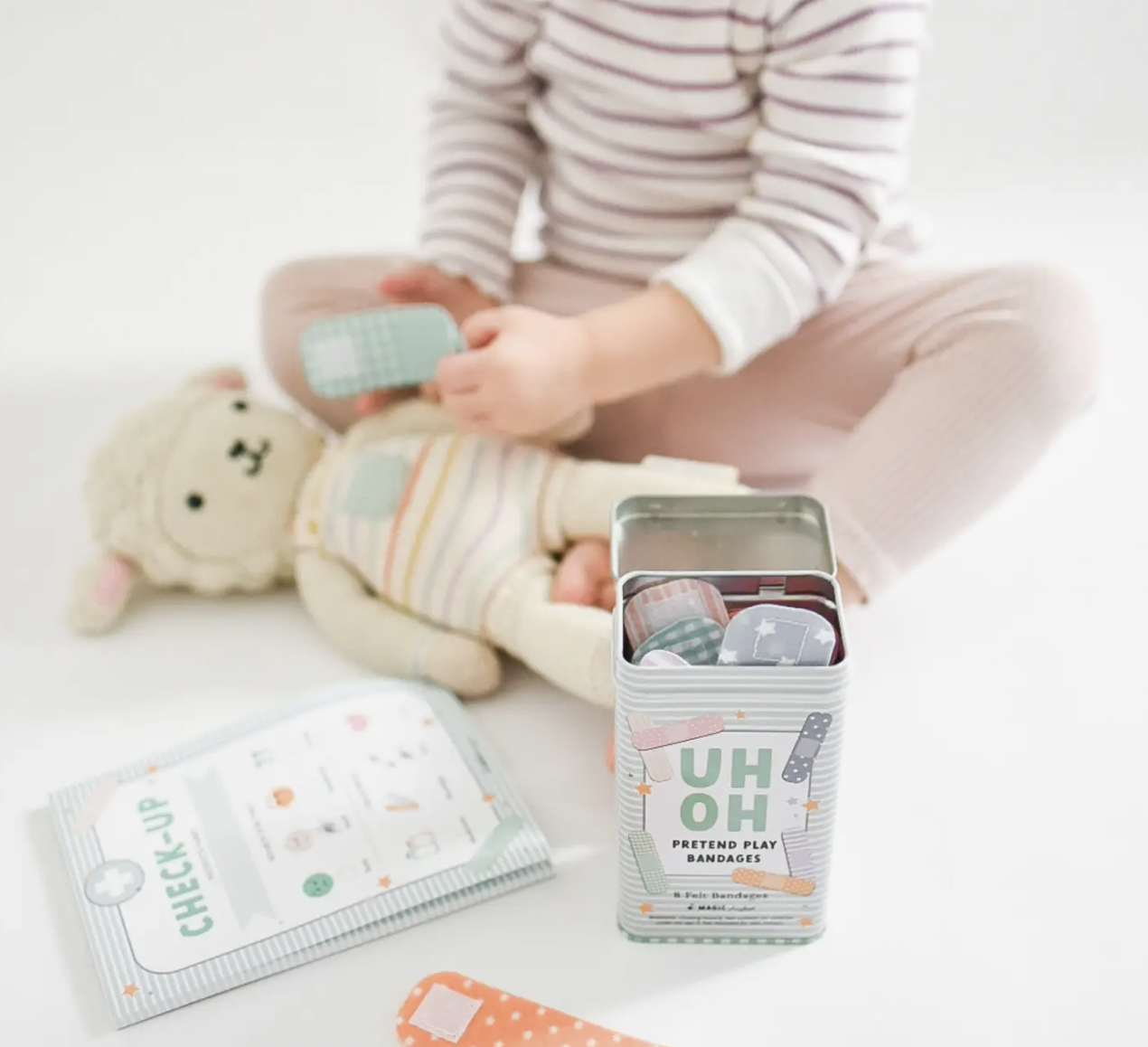 This set includes 8 felt bandages with velcro closures designed to be used over and over again on stuffed animals and dolls. Packaged in a classic oversized bandage tin perfect for gifting and storage.