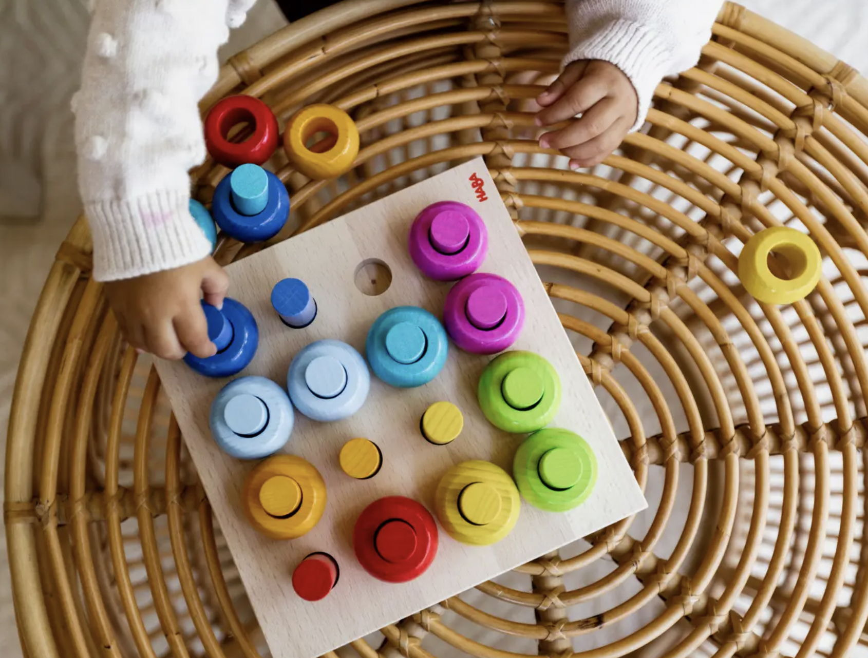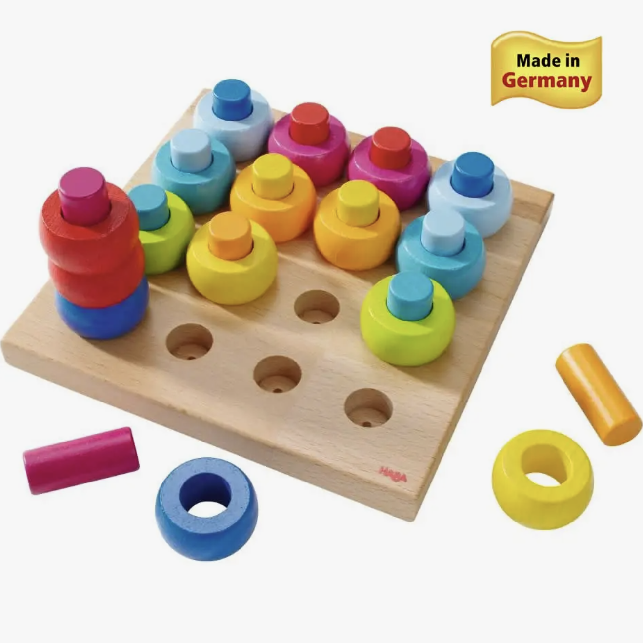 The colored pegs and rings offer many different plug-in variations. The rings can also be piled up on the pegs making this game ideal for free-play. For HABA responsibility is written in Capital letters. This game is made of Beech wood that comes from sustainable forestry in Germany . When applying colors, we use multiple layers of water-based, solvent-free lacquers making the surface extremely resistant to wear and tear allowing the toy to be taken from the hand to the mouth.
