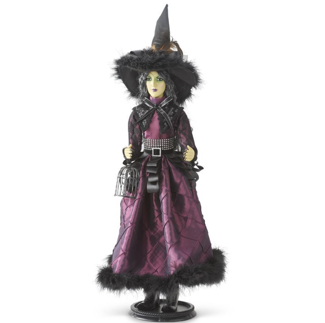 This gorgeous and unique witch is handcrafted and hand painted. She holds a cage with a raven in her right hand and dons a dark purple satin dress. She stands on her own at 30.5" tall.