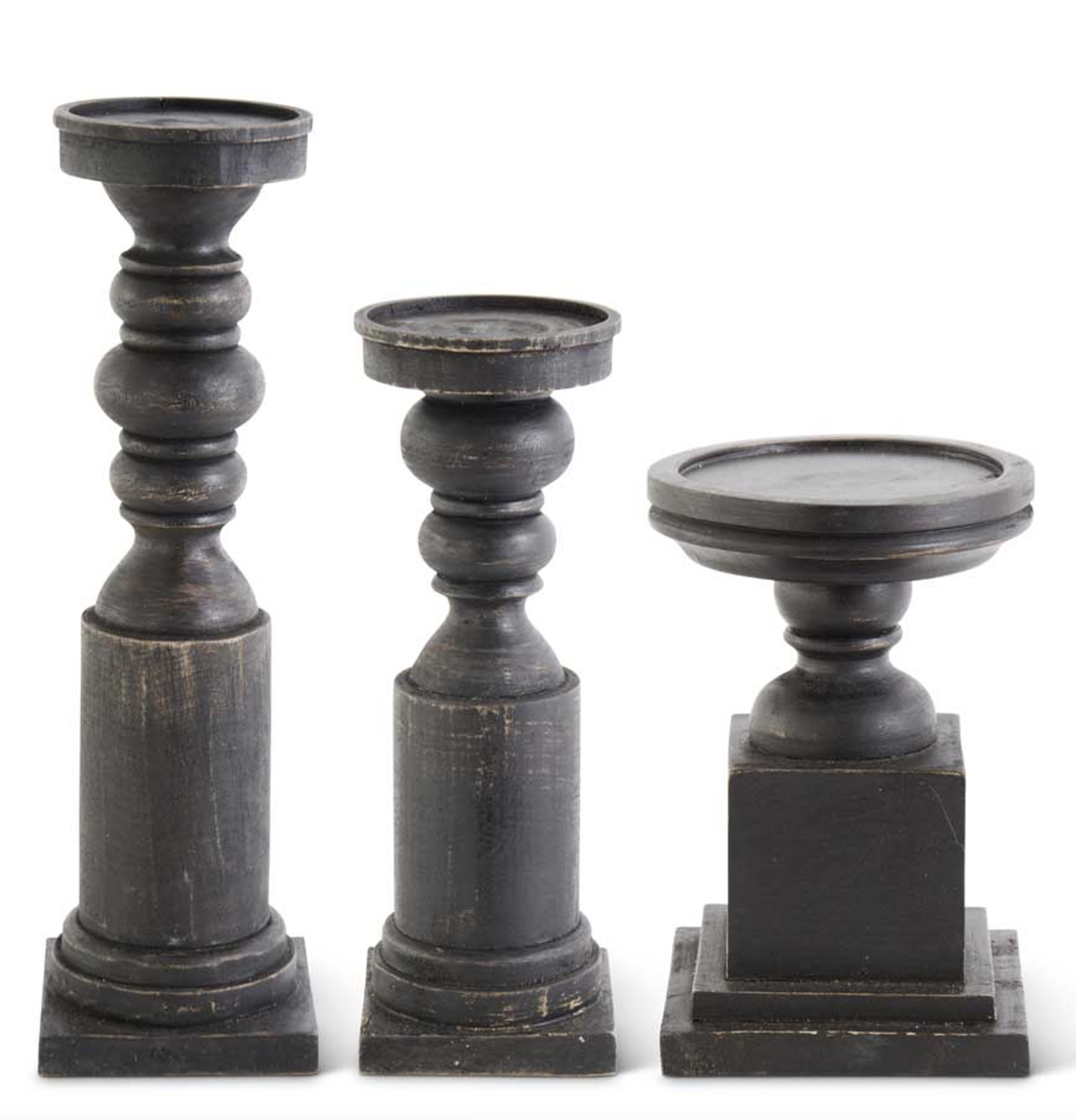 Set of 3 square base candleholders, made out of mango wood. The set contains varying sizes of 9.5 inches, 15.75 inches, and 20 inches.