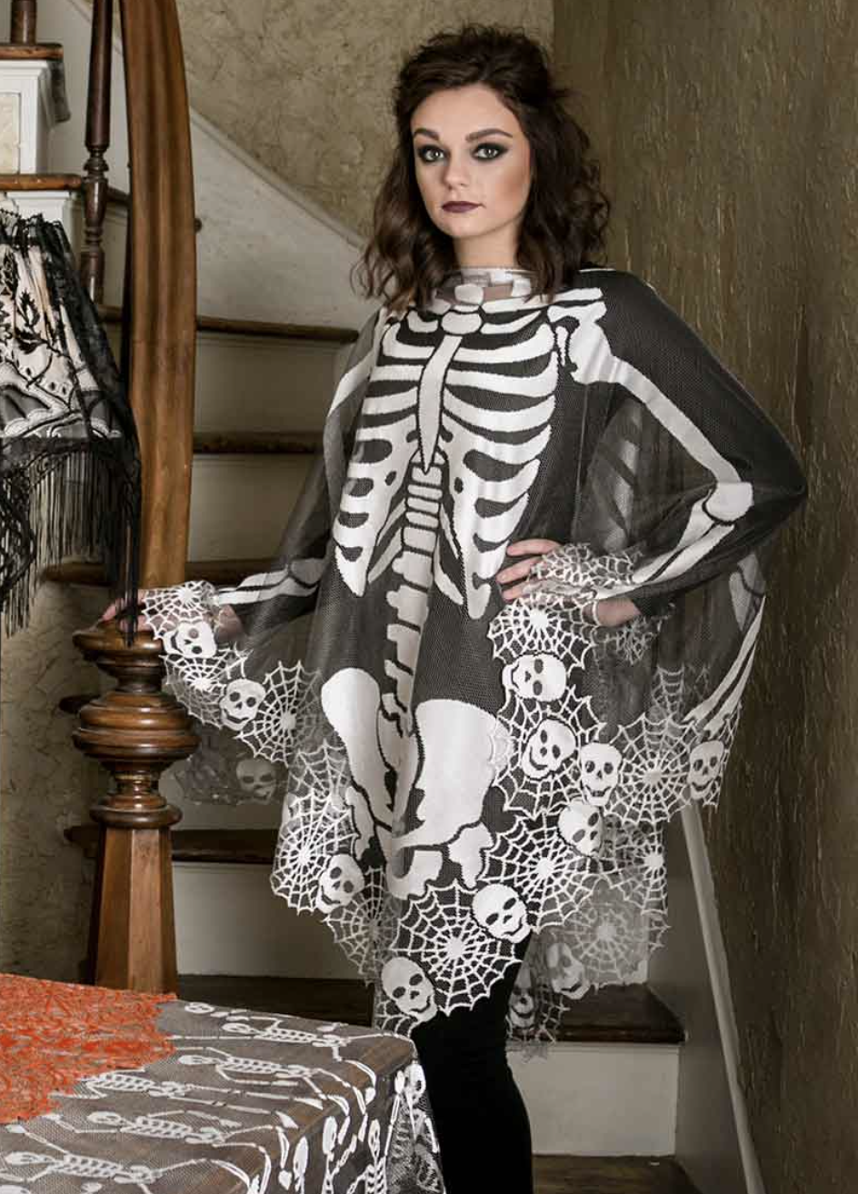 Get ready for a spooky night with this Skeleton poncho. Whether you’re off to a party or staying home to hand out candy, the Skeleton poncho is sure to showcase your Halloween spirit. Poncho features life-size skeleton design accented by cobweb and skull boarder. You’ll be sure to scare up scores of compliments with this shimmery pewter and black accessory.