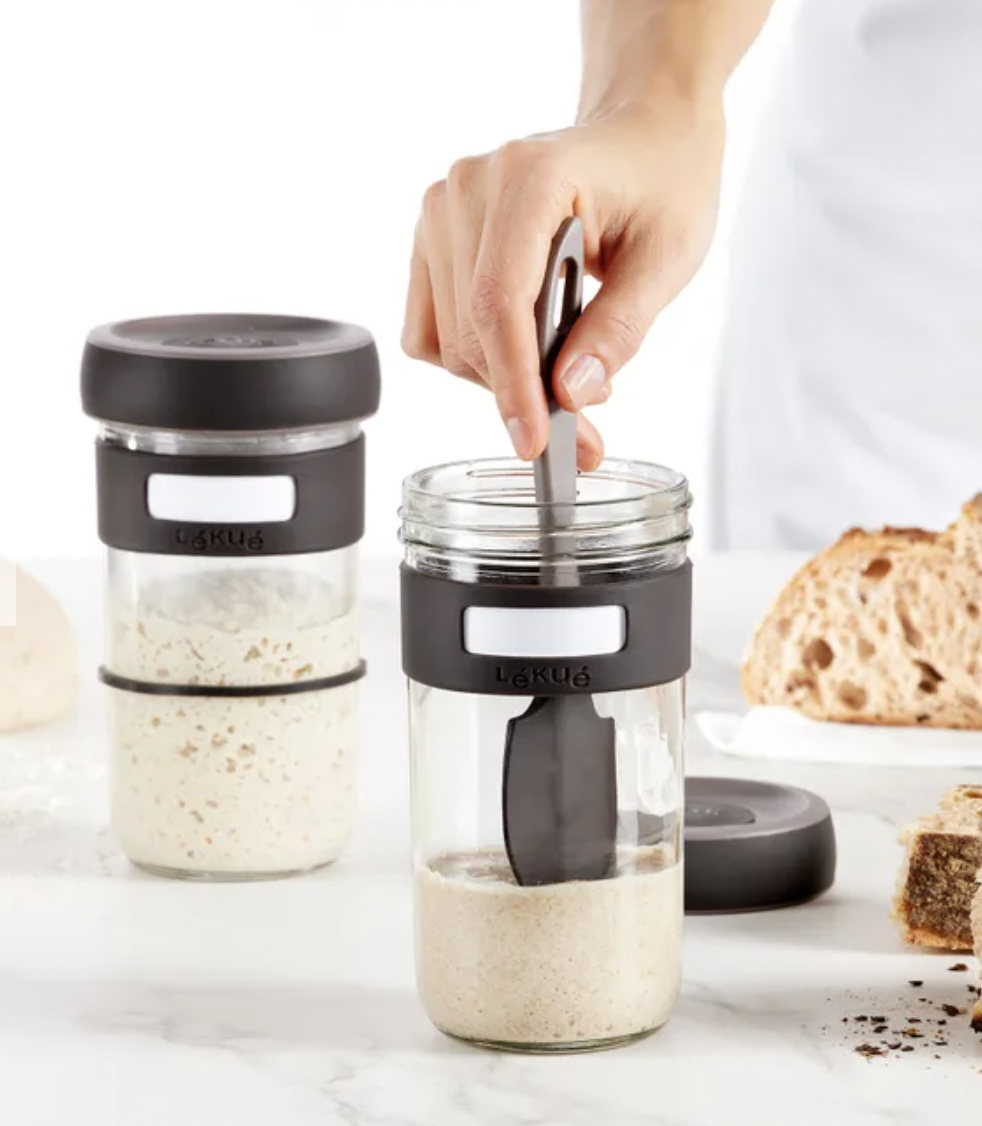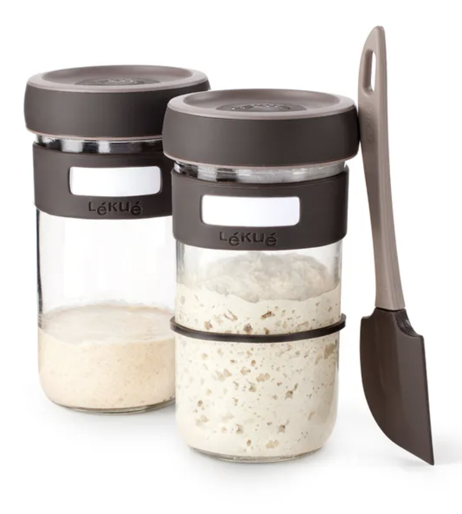 With this practical kit, it’s easy to make your own sourdough at home. This starter kit contains: two glass jars and a spatula. Each jar includes a lid with a valve to vent the gases, a silicone strip that acts as a marker, and a silicone ring which you can use to track the dough as it rises. It also includes a brochure detailing how to use it, and three delicious recipes to use the sourdough, including one for pizza dough.