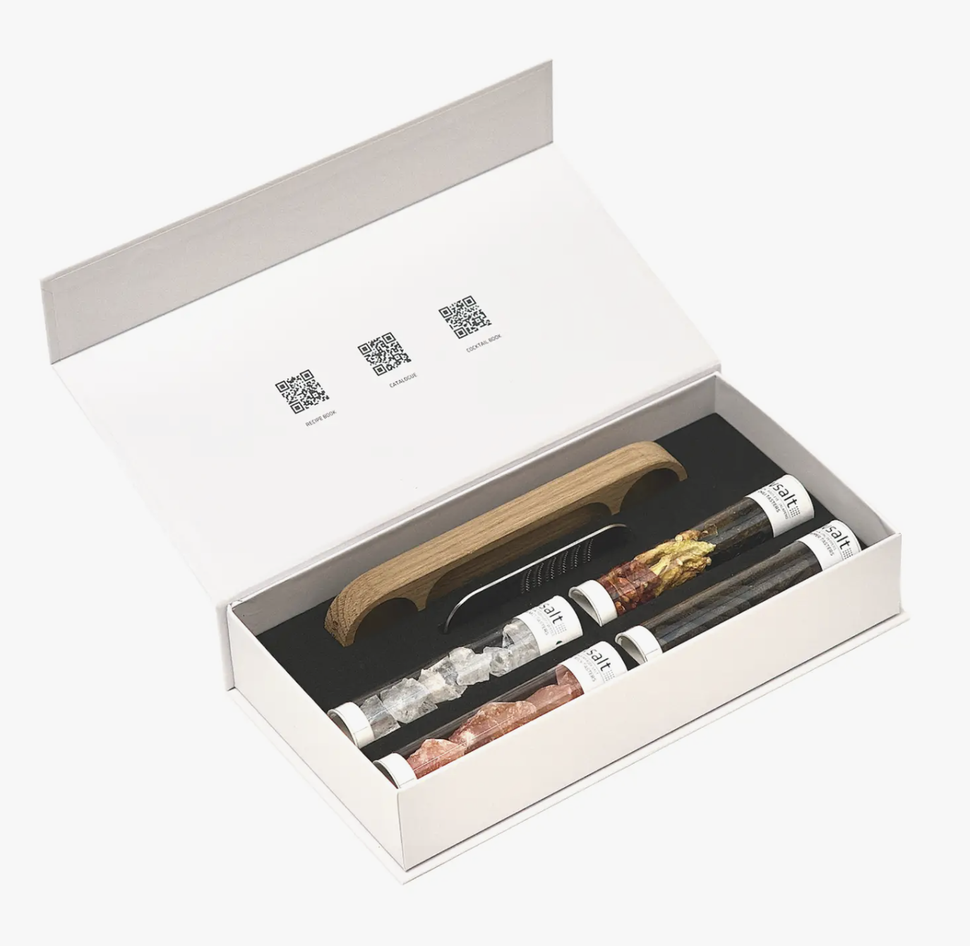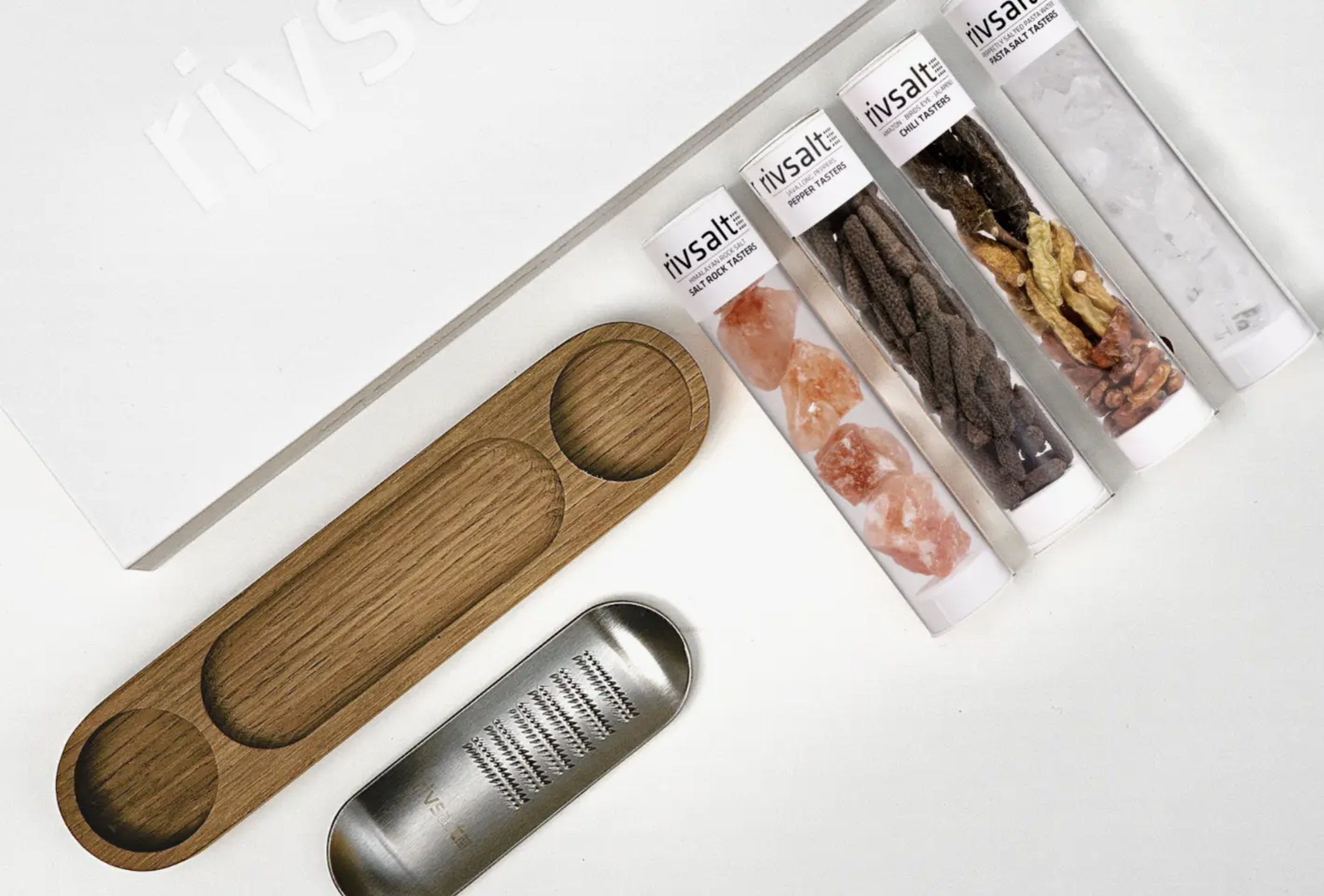 Our SPICE TASTERS GIFT BOX includes our most functional grater yet + a flat wood table stand. The metal-wood combo looks great both in the kitchen and on the dining table. We have also included four tubes containing (1) Highly flavored Himalayan salt (2) Aromatic Java Long Pepper (3) Hot, fruity, organic Chili Mix (4) Pasta Salt, securing perfectly salted pasta every-time.