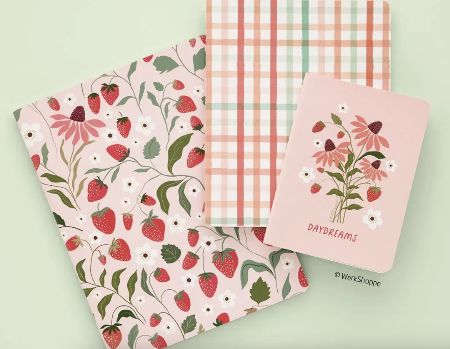 Like fresh picked strawberries this set of 3 coordinating and graduating in size stitched notebooks are ready to be enjoyed and of service.