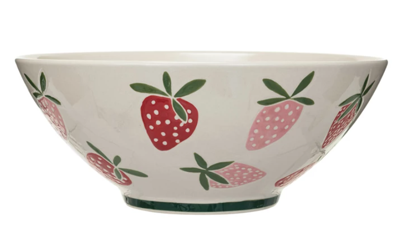 Catalog Name: 10-1/2" Round x 4-1/4"H Hand-Painted Stoneware Bowl w/ Wax Relief Strawberries, Multi Color ©