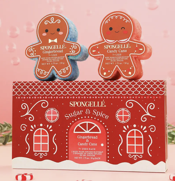 Unwrap the magic of the season with Spongellé’s Sugar & Spice gift set featuring two charming gingerbread-shaped Body Wash Infused Buffers in Gingerbread and Candy Cane. Enriched with skin-softening extracts, these adorable buffers leave your skin feeling soft, smooth, and refreshed. Share the joy of the holidays with a gift that's both decadent and indulgent. Each body buffer is good for 7+ uses.