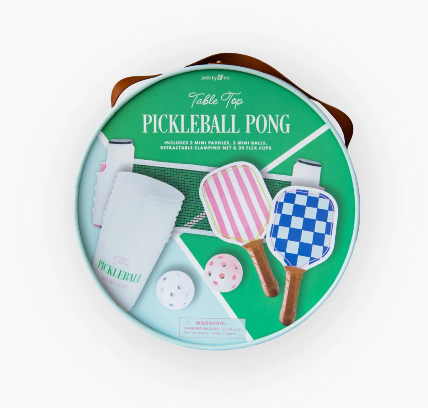 Get ready to dink, drink, and dominate! Introducing Tabletop Pickleball Pong—a mini pickleball party game that brings big energy to any gathering! Think pickleball meets party pong: less running, way more giggling. Rally your crew, grab your paddles, and aim for your opponent’s cups. Perfect for pre-games, post-dinner smackdowns, or anytime you want to paddle your way to party legend status. Let the games begin! Game set includes: 1 Table Pong Game Set 2 Mini Paddles 2 balls – 1 pink & 1 white 20 flex cups Mini Net – extends to approximately 6 feet Game comes packaged in a carrying case with handle measuring 12.5″ diameter x 5.25″ tall