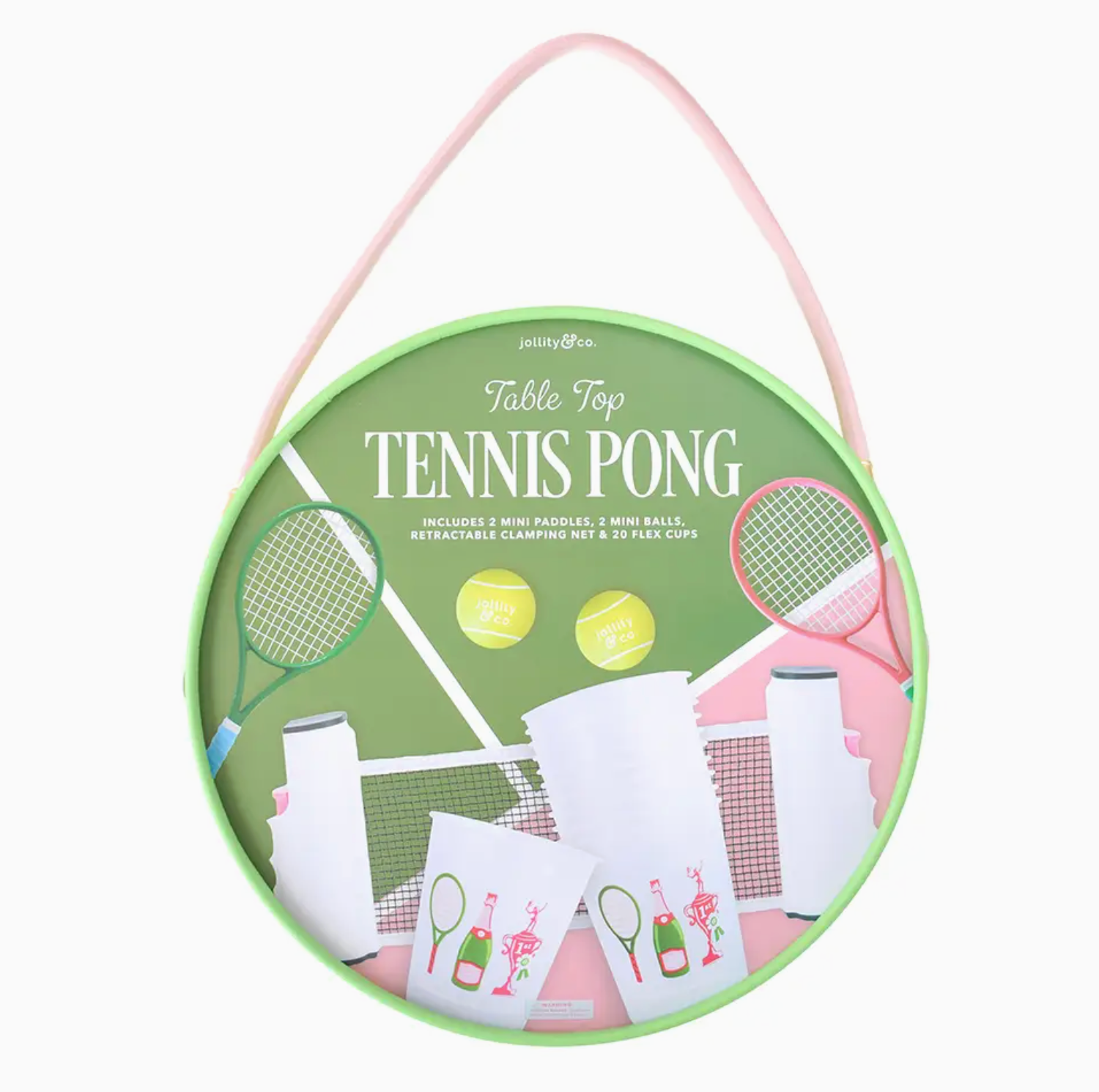 Game. Set. Sip! Tennis Pong takes your party game to center court with a playful twist on the classic. Serve up some friendly competition at your next gathering — perfect for backyard BBQs, birthday bashes, or sipping and scoring with your best doubles partner. Let the rally begin! Pack of 1 Game Set Set Includes: x2 Mini Rackets x2 Mini “Tennis” Ping Pong Balls x20 Flex Cups x1 Retractable Net – extends to approx 6 feet x1 Carrying Case Instruction Sheet Game comes packaged in a carrying case with handle measuring 12.5″ diameter x 5.25″ tall