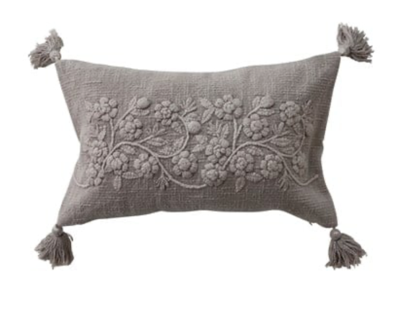 Taupe Floral Embroidered Lumbar Pillow w/Tassels