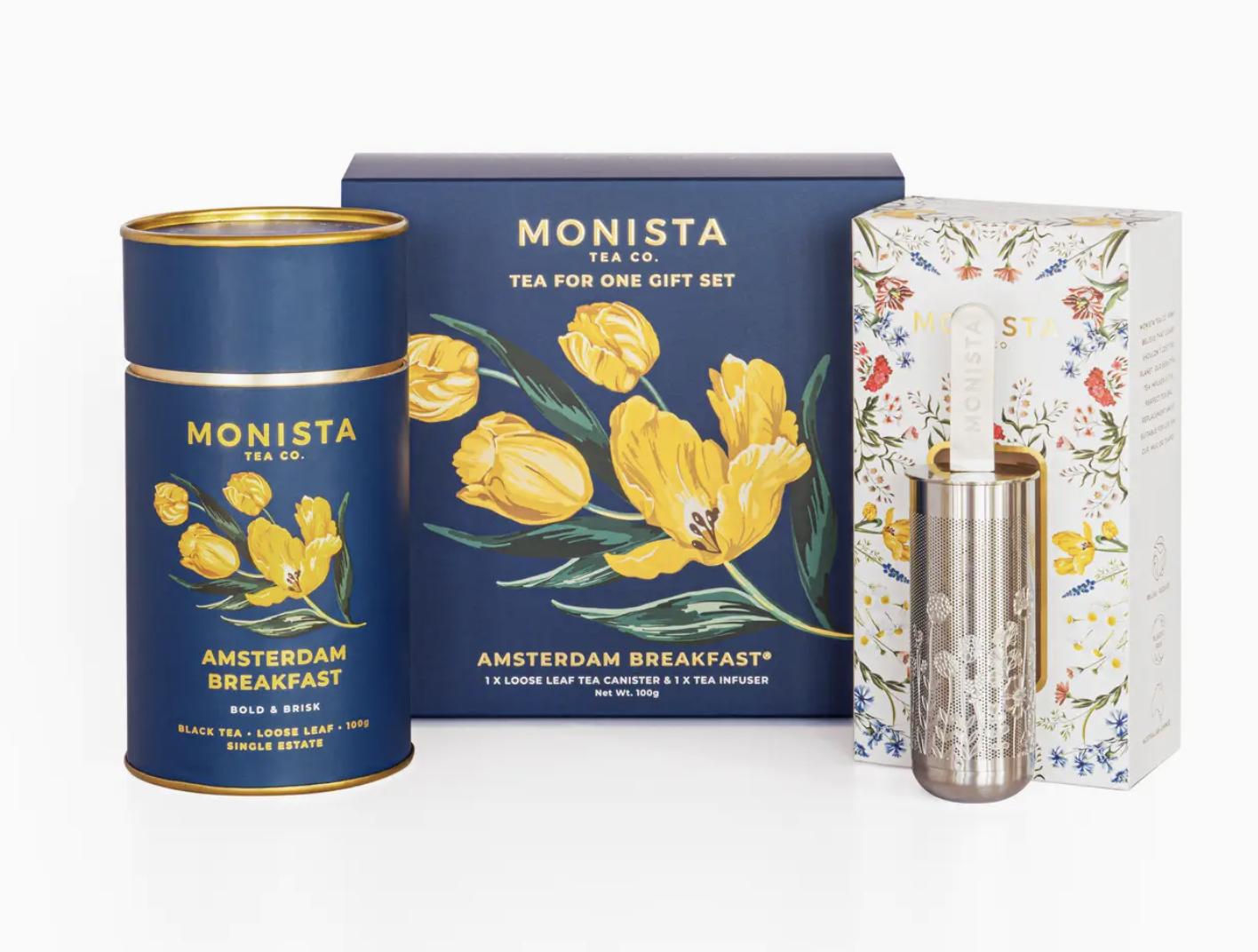 Monista’s Tea for One Gift Set includes a canister of Amsterdam Breakfast and a silver stick infuser.