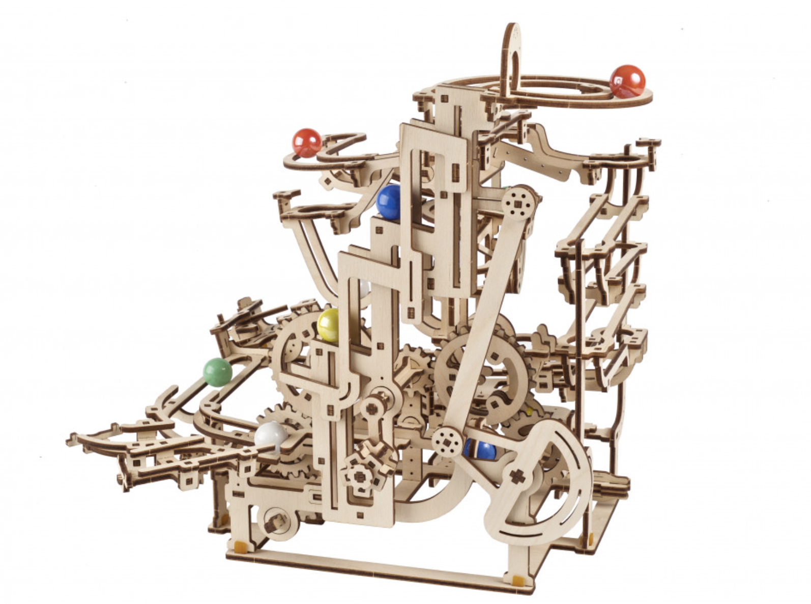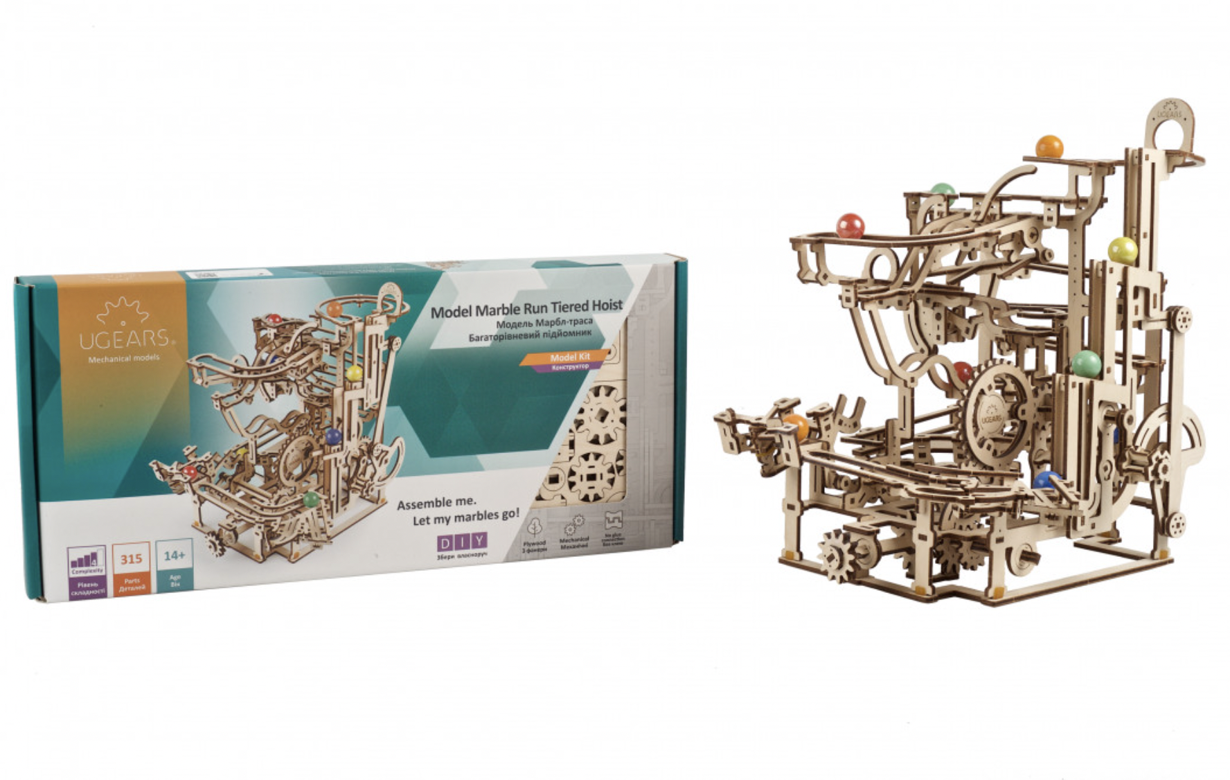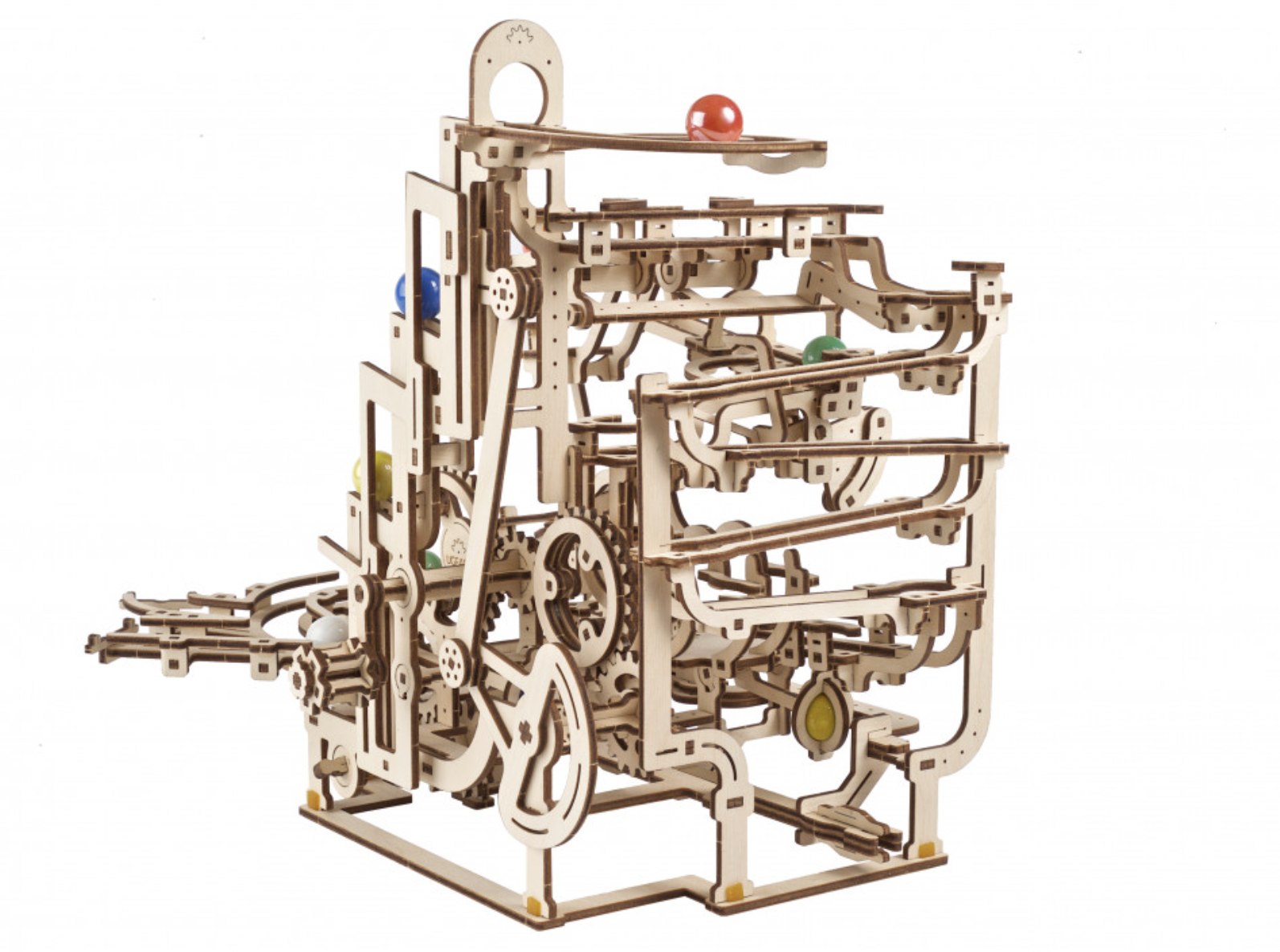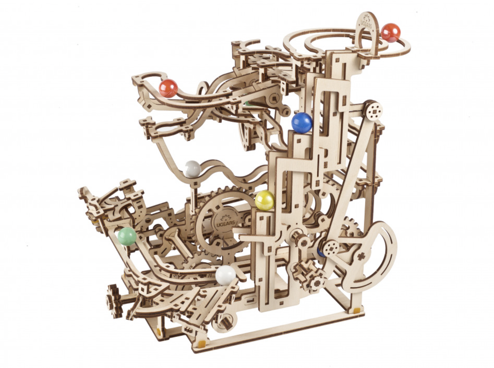 The fun with marble runs continues with Ugears’ Marble Run Tiered Hoist, the third in a series of Ugears modular marble runs. This unique entrant in our growing collection of entertaining wooden marble runs features a 3-tiered stair lift that raises the marbles to the top for amusement park adventures. This wooden DIY kit is both a 3D puzzle and a fun toy. The Marble Run Tiered Hoist features a fascinating lift, three new track elements, and interesting trap and release mechanisms sprinkled throughout. Turn the hand crank and watch the marbles make their journeys through various obstacles down to the collection tray below. Multiple tracks and elements are packed into a compact space in this well-designed DIY marble run.