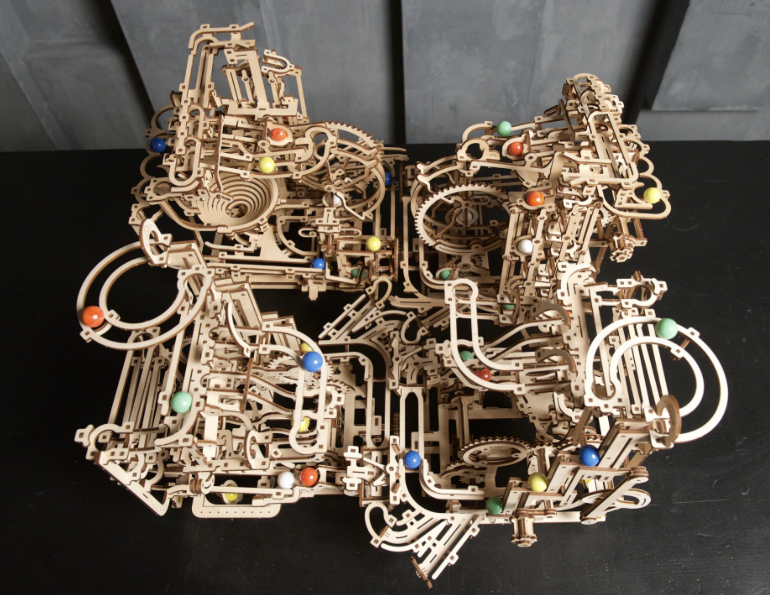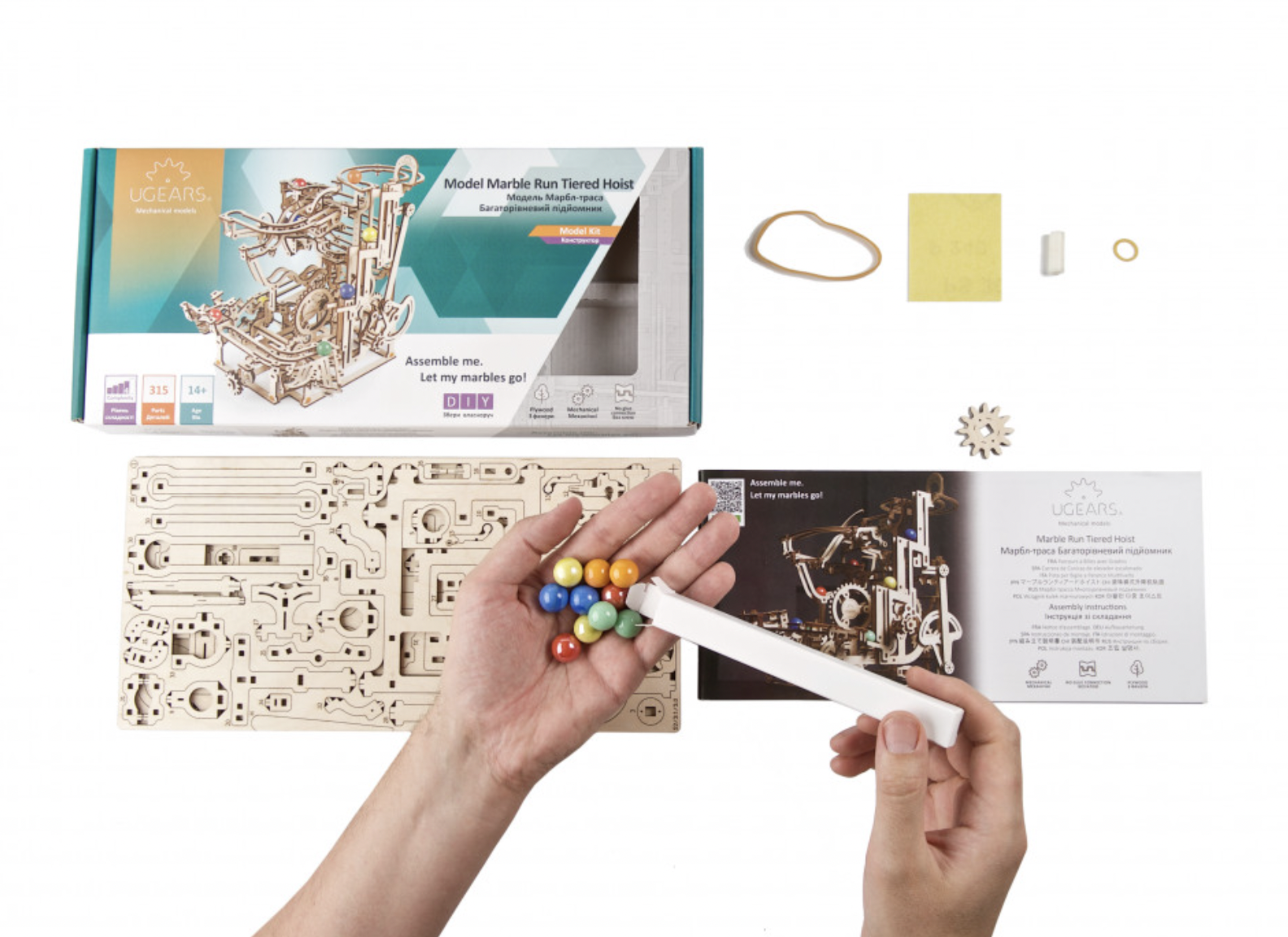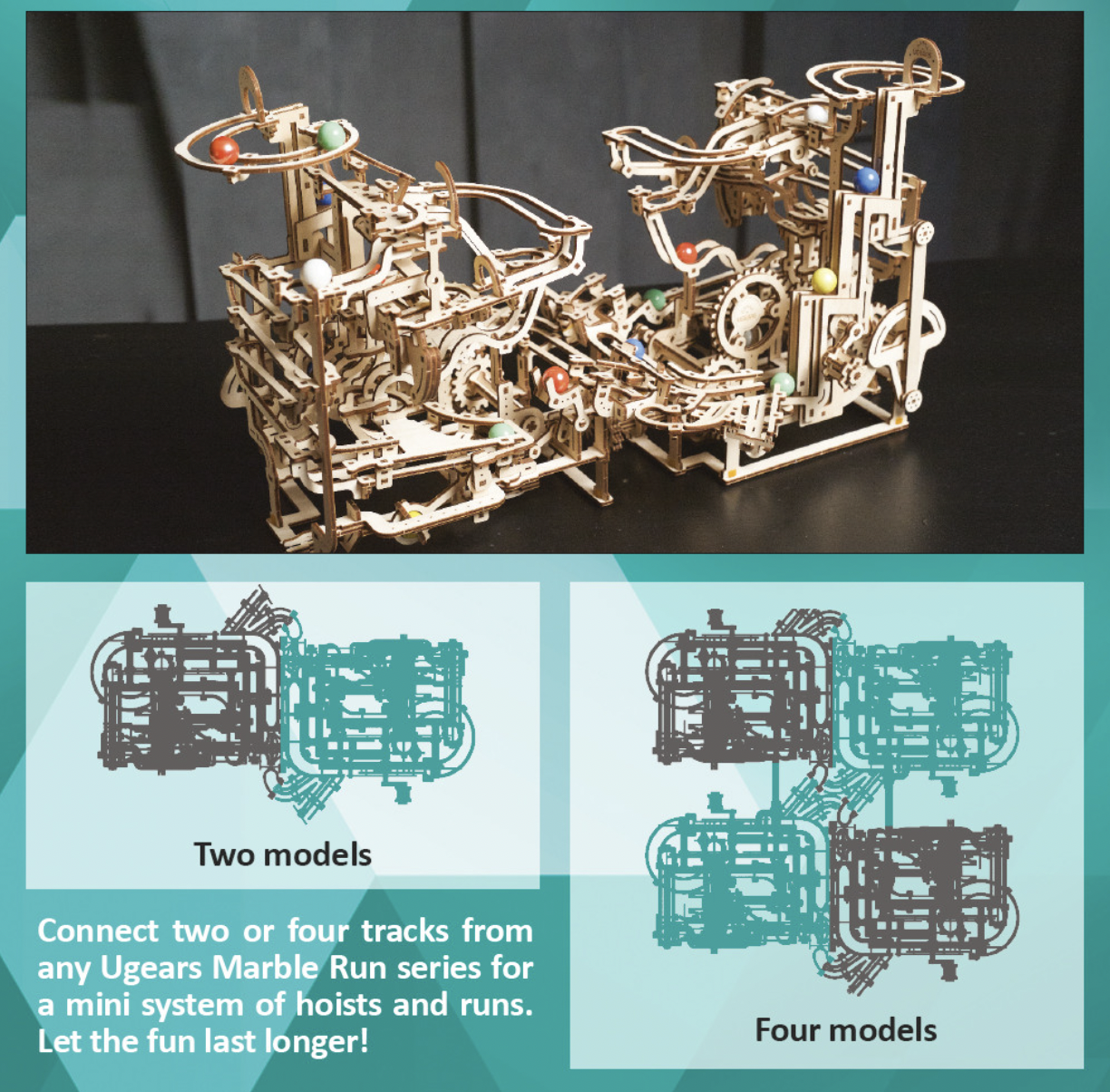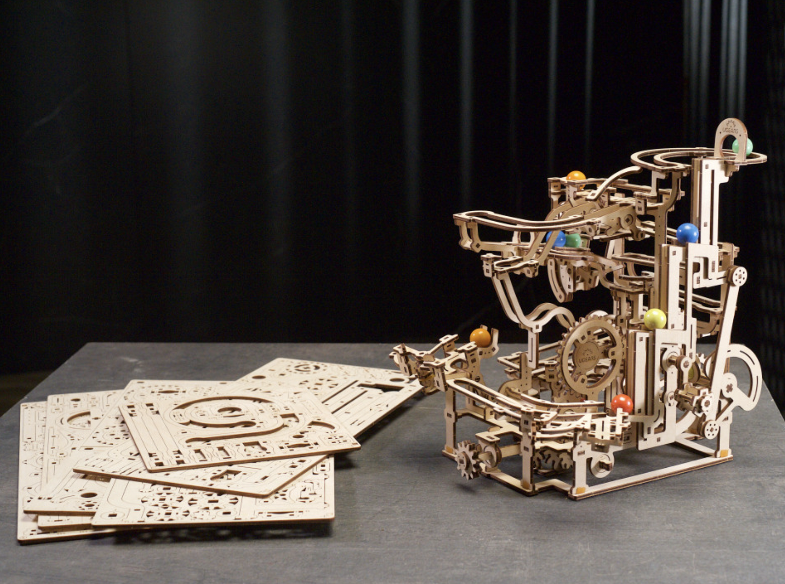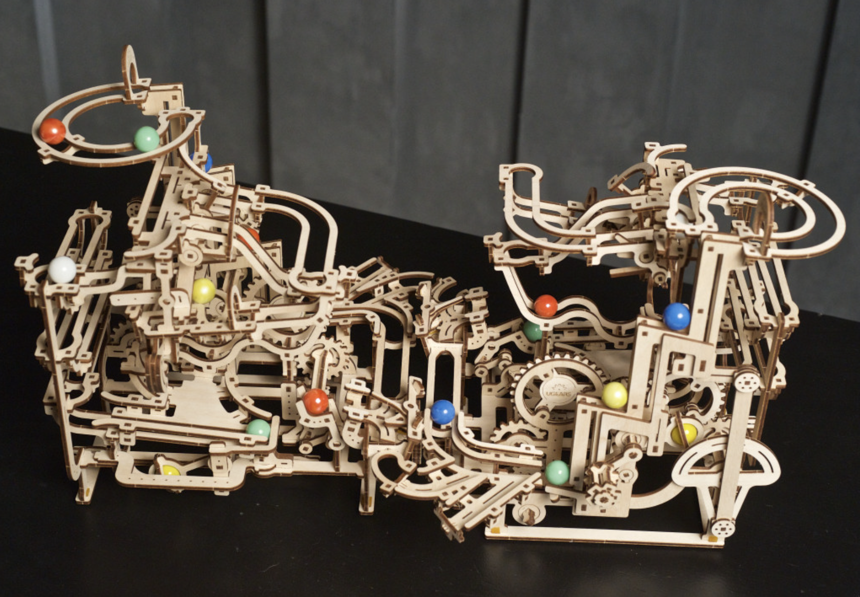 The fun with marble runs continues with Ugears’ Marble Run Tiered Hoist, the third in a series of Ugears modular marble runs. This unique entrant in our growing collection of entertaining wooden marble runs features a 3-tiered stair lift that raises the marbles to the top for amusement park adventures. This wooden DIY kit is both a 3D puzzle and a fun toy. The Marble Run Tiered Hoist features a fascinating lift, three new track elements, and interesting trap and release mechanisms sprinkled throughout. Turn the hand crank and watch the marbles make their journeys through various obstacles down to the collection tray below. Multiple tracks and elements are packed into a compact space in this well-designed DIY marble run.