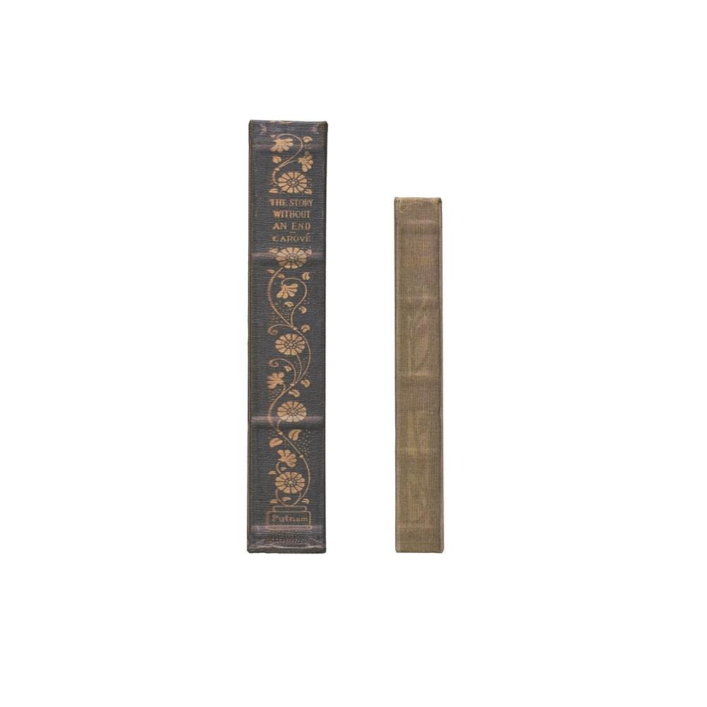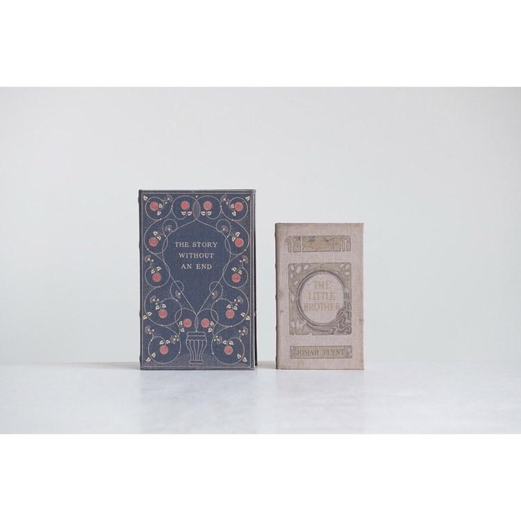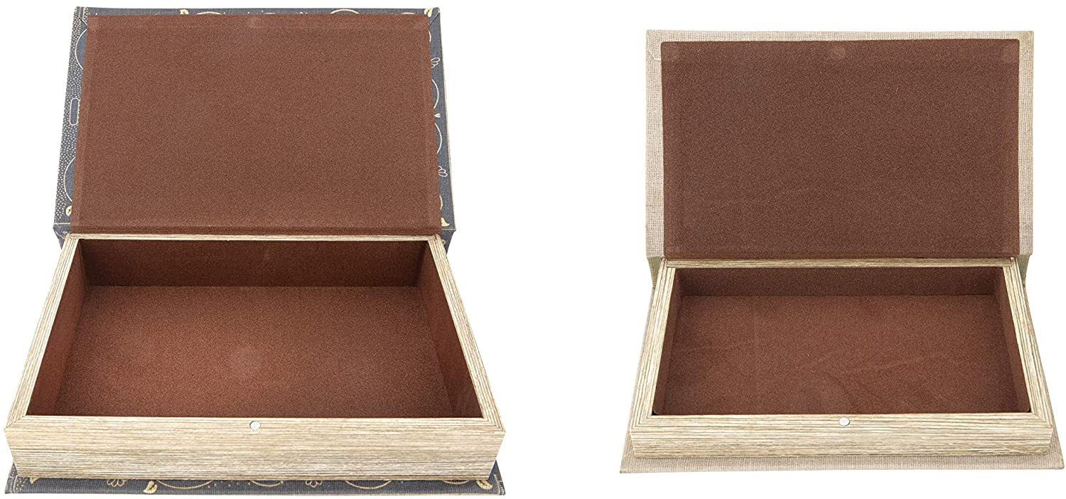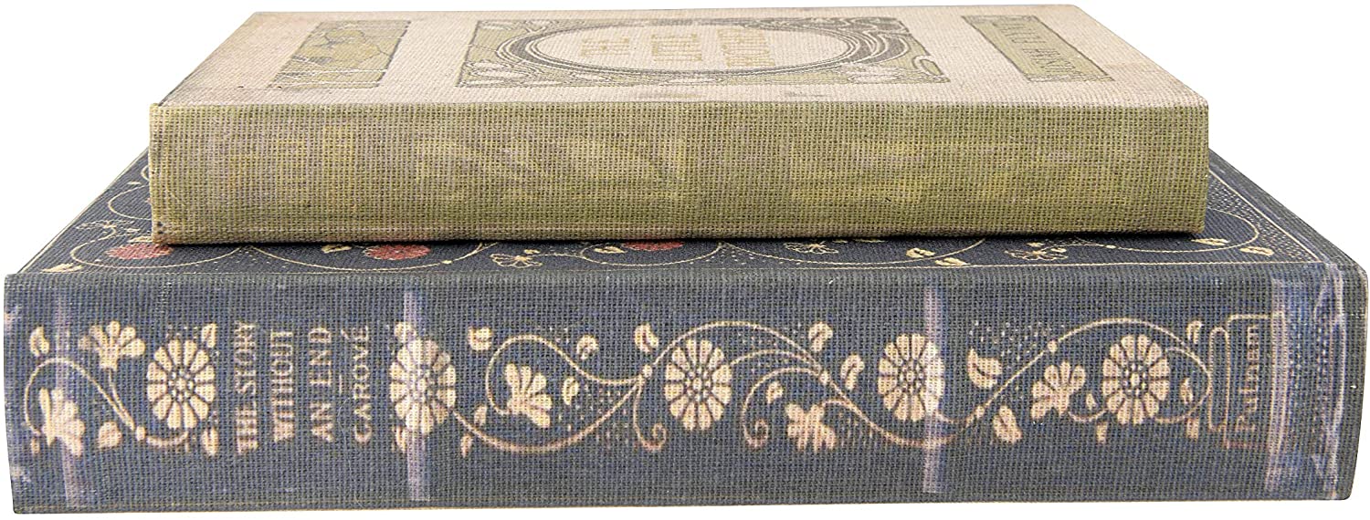 This set of 2 storage book boxes, each featuring a faded canvas print made to look like an authentic vintage book, are perfect for storing small items while adding color and texture to your farmhouse style displays and double as beautiful risers when stacked on top of each other. Hollowed inside of the book allows you to hide items inside such as cash, jewelry, or keys. These book boxes are a great way to keep personal items hidden and yet easily accessible.