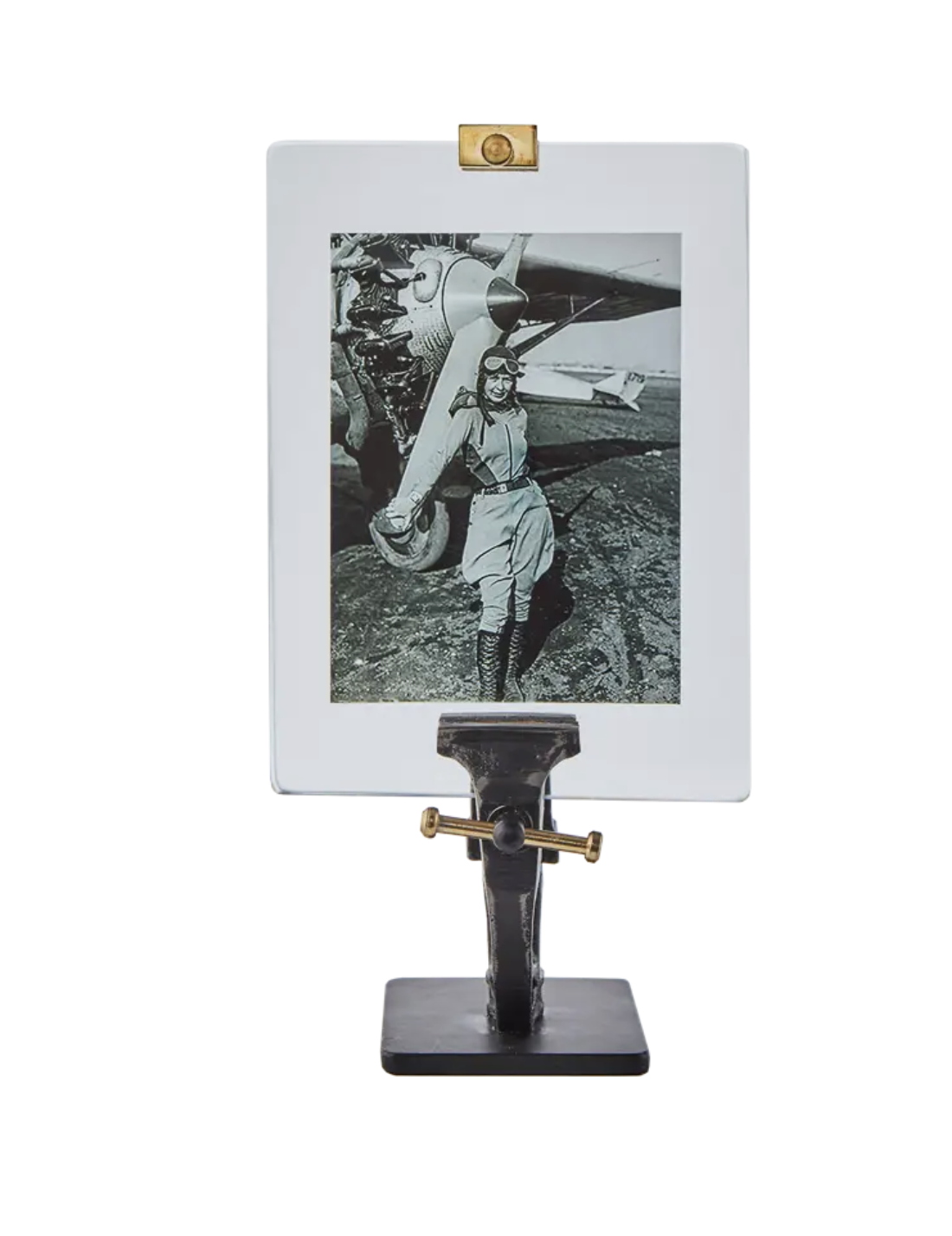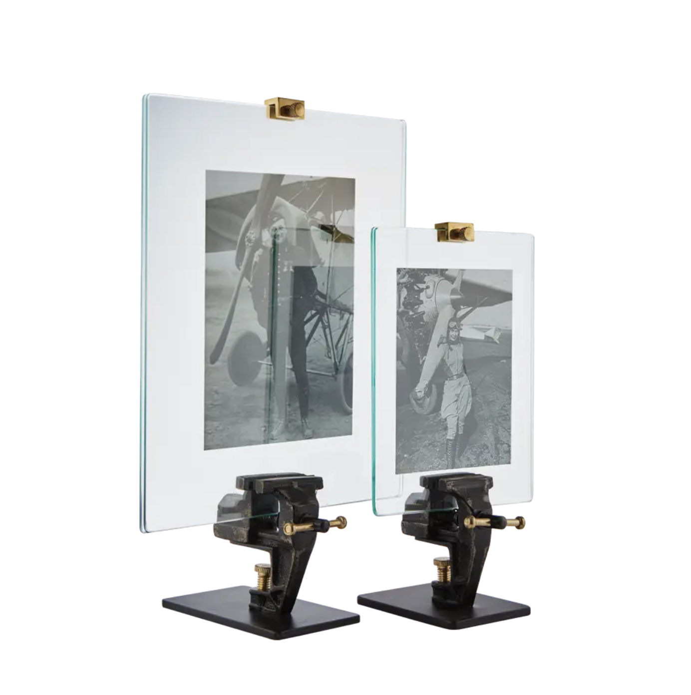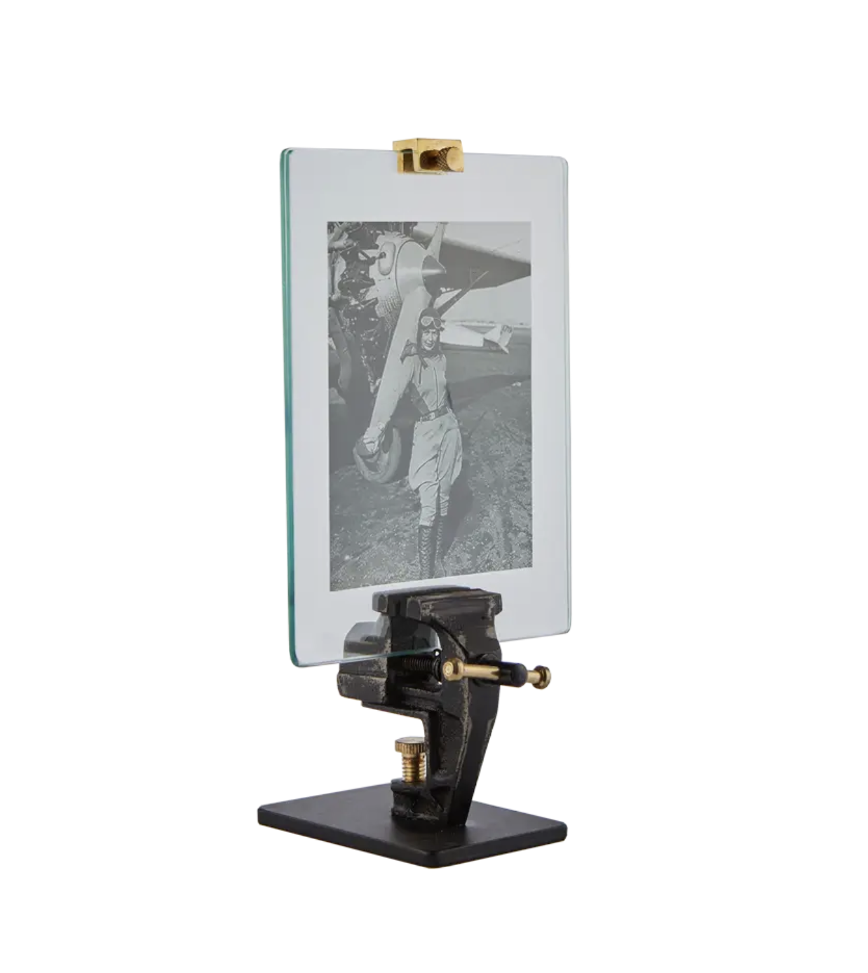 Miniature salesman’s samples have caught our imagination again. This small replica of a steelworker’s vise would have been carried in a briefcase to sales calls instead of the full sized vise (a little difficult to carry even for the sturdiest salesman). Ours is cast iron as the original would have been and has been fitted with padding and a solid base to create a unique photo frame that perfectly captures the beauty of industrial instruments.