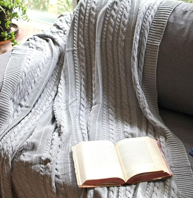 100% ORGANIC cotton knitted cable knit throw blanket in many colors – luxurious, pure, comfortable, warm, cozy, super soft, natural, eco-friendly, vegan, pesticide and chemical free.