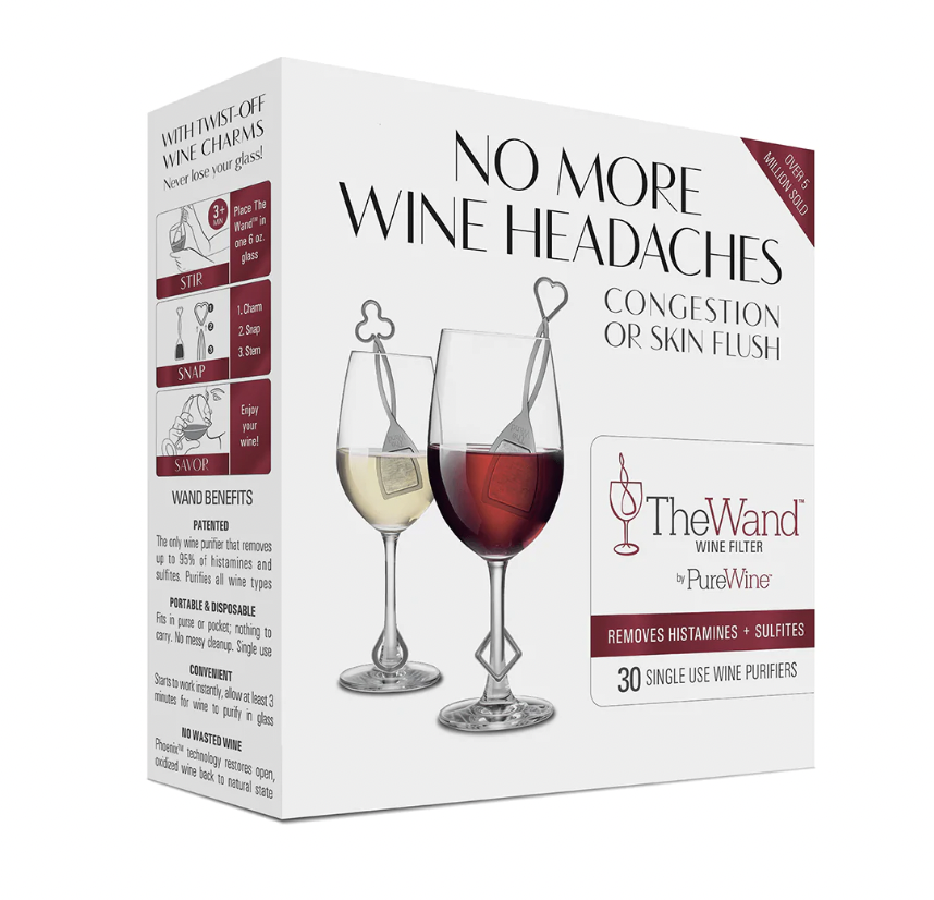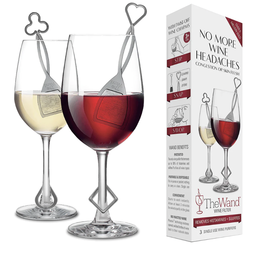 The Wand™ wine purifier is the only product available that purifies your wine by removing both histamines and sulfites from a single glass of wine. Each box contains an assortment of twist-off wine charms including hearts, lucky clovers, diamonds and wine drops.
