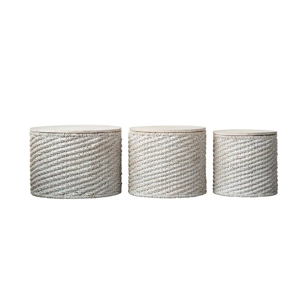Natural Woven Water Hyacinth Tables w/ Mango Wood Top, Whitewashed